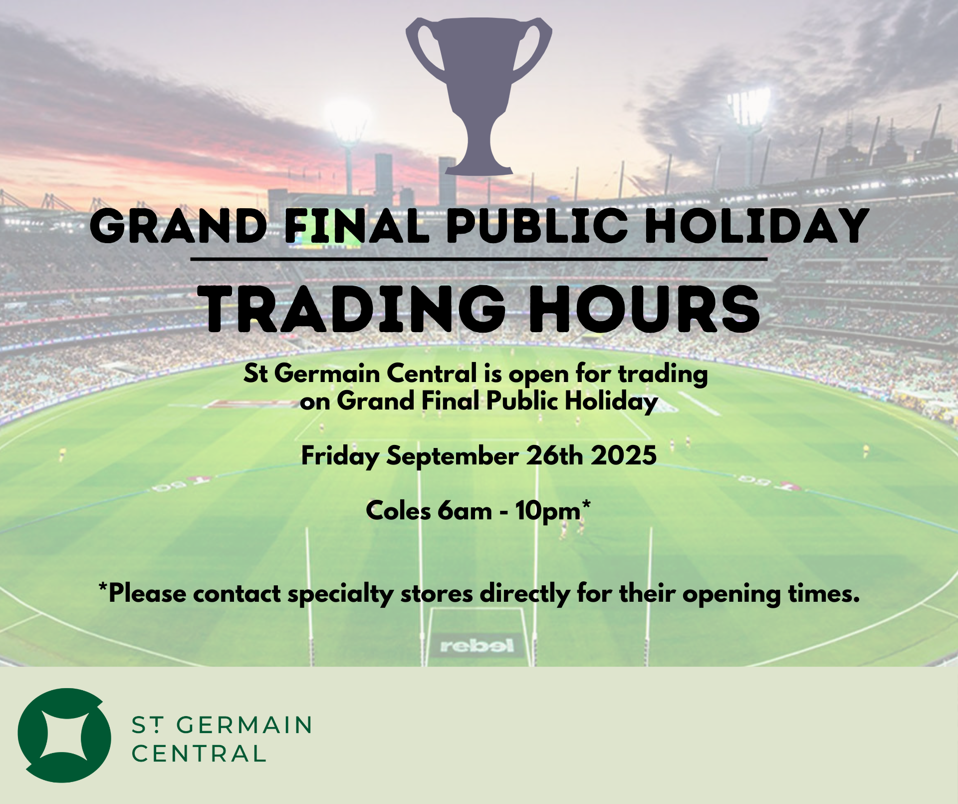 St Germain Central is open for trading on the AFL Grand Final Public Holiday: Friday September 26th 2025