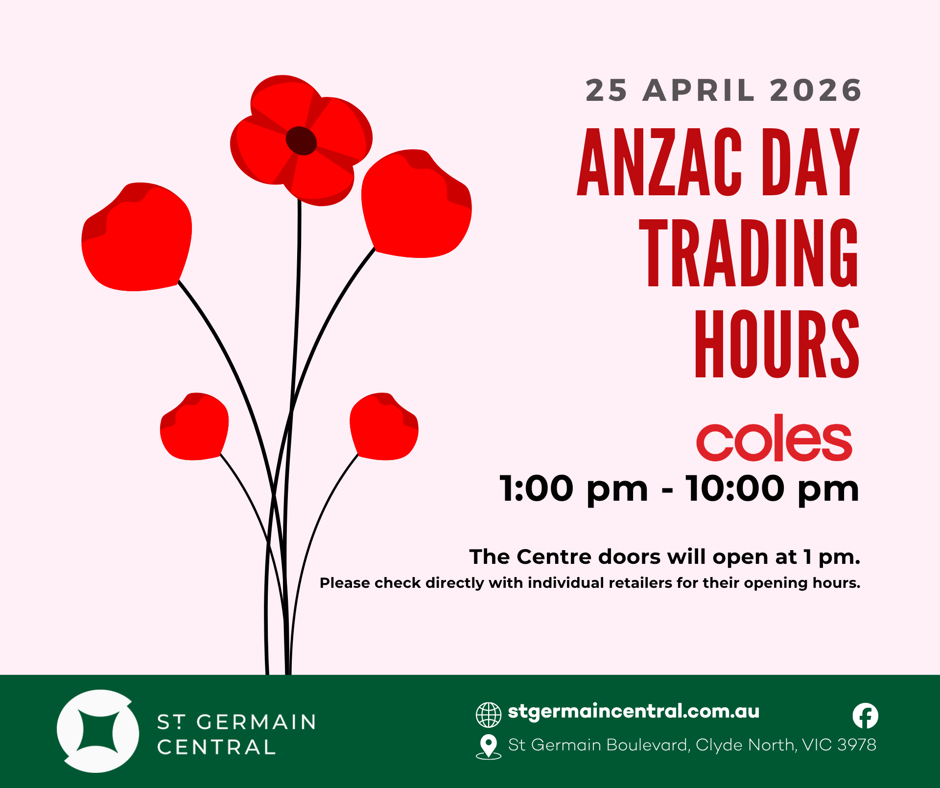 St.Germain Central will be closed on Anzac Day until 1pm. We will be trading as usual from 1pm onwards, with Coles open until 10pm.